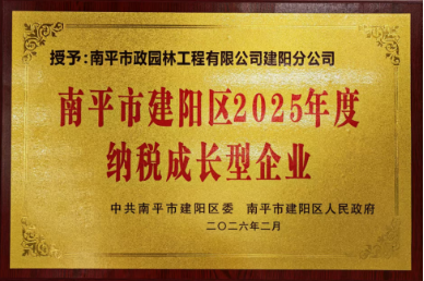 南平市政園林工程有限公司: 建陽區(qū)2025年度納稅成長型企業(yè) 市政園林公司深耕市政園林領(lǐng)域,憑借卓越的工程品質(zhì)和良好的市場信譽(yù),業(yè)務(wù)發(fā)展迅速,企業(yè)效益與納稅貢獻(xiàn)同步實(shí)現(xiàn)顯著增長。